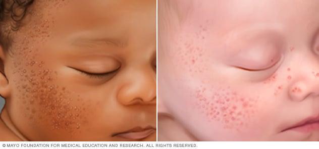 Baby acne is a condition that causes small bumps on a newborn's skin — often on the face and neck. Baby acne is common and temporary. There's little you can do to prevent it, and it often clears up on its own without scarring.