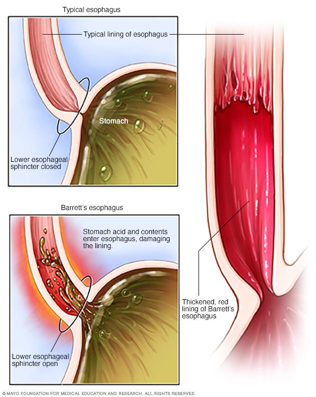 Barrett's esophagus is associated with an increased risk of developing esophageal cancer. Although the risk of developing esophageal cancer is small, it's important to have regular checkups with careful imaging and extensive biopsies of the esophagus to check for precancerous cells (dysplasia). If precancerous cells are discovered, they can be treated to prevent esophageal cancer.
