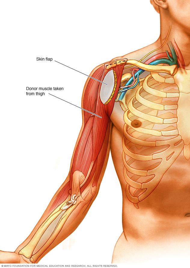 - Muscle transfer. In muscle transfer, a surgeon removes a less important muscle or tendon from another part of the body, such as the thigh, transfers it to the arm, and reconnects the nerves and blood vessels to the muscle.