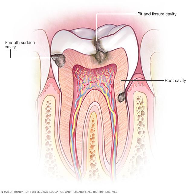 Cavities are areas in the hard surface of your teeth that are damaged. These areas of tooth decay become tiny openings or holes that can lead to a serious toothache, infection and tooth loss. There are several causes of cavities, including bacteria in your mouth, snacking a lot, sipping sugary drinks and not cleaning your teeth well.