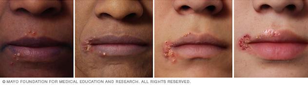 - Blisters. Small fluid-filled blisters often form along the border of the lips. Sometimes they appear around the nose or cheeks or inside the mouth.