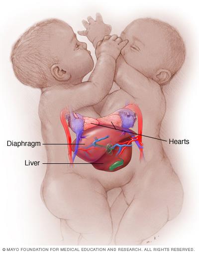 Conjoined twins develop when an early embryo only partially separates to form two individuals. Although two babies develop from this embryo, they remain physically connected — most often at the chest, abdomen or pelvis. Conjoined twins may also share one or more internal body organs.