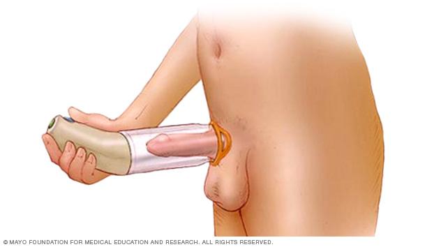 Penis pumps. A penis pump, also called a vacuum erection device, is a plastic tube that fits over the penis. A hand or battery-powered pump attaches to the tube. The pump sucks air out of the tube. This makes a vacuum that pulls blood into your penis.