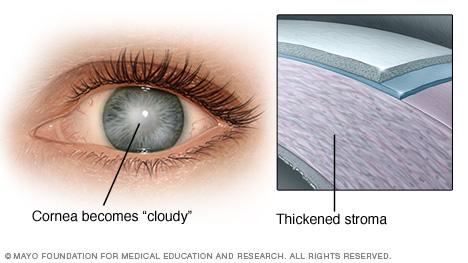 Fuchs dystrophy is a condition in which fluid builds up in the clear tissue at the front of the eye, called the cornea. This causes your cornea to swell and thicken, leading to glare, blurred or cloudy vision, and eye discomfort.