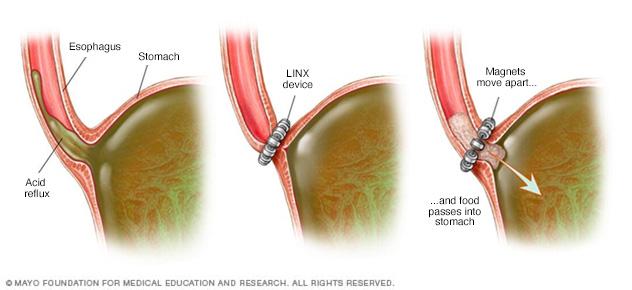 - LINX device. A ring of tiny magnetic beads is wrapped around the junction of the stomach and esophagus. The magnetic attraction between the beads is strong enough to keep the junction closed to refluxing acid, but weak enough to allow food to pass through. The LINX device can be implanted using minimally invasive surgery. The magnetic beads do not affect airport security or magnetic resonance imaging.