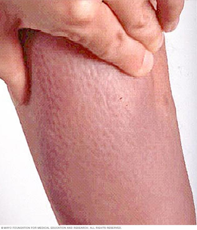 Rarely, people with Graves' disease have darkening and thickening of the skin. It most often appears on the shins or the tops of the feet. The skin has a texture like an orange peel.