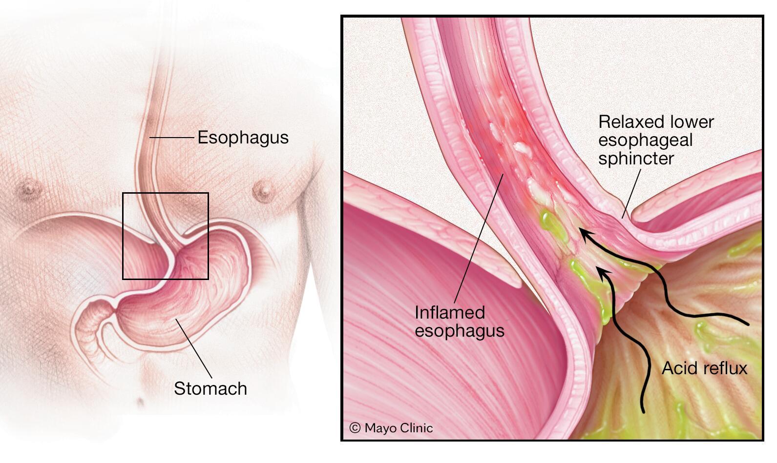If the lower esophageal sphincter isn't working as it should, stomach acid can flow back up into the esophagus and cause heartburn. The acid reflux may be worse when you're bent over or lying down.