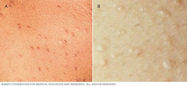 - A less common form of heat rash is called miliaria profunda. It affects the deepest layer of the skin (dermis). It causes firm, painful or itchy inflamed bumps that look like goose bumps and may break open.