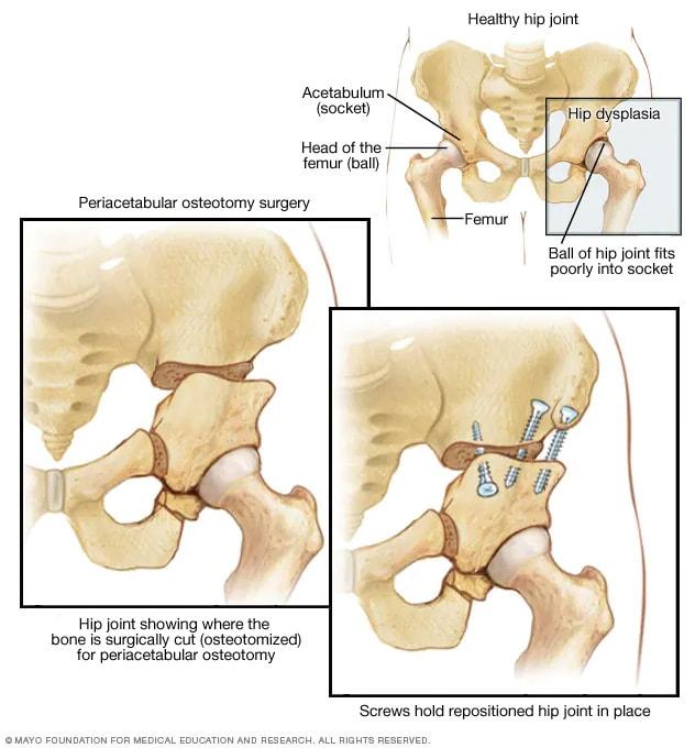If the dysplasia is more serious, the position of the hip socket also can be corrected. In a periacetabular (per-e-as-uh-TAB-yoo-lur) osteotomy, the socket is repositioned in the pelvis so that it matches up better with the ball.