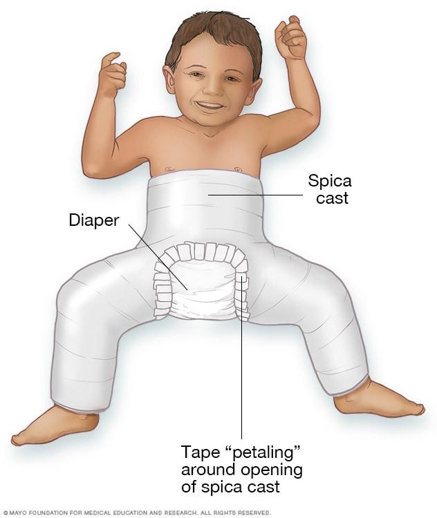 The brace doesn't work as well for babies older than 6 months. Instead, the healthcare professional may move the bones into the proper position and then hold them there for several months with a full-body cast. Sometimes surgery is needed to fit the joint together properly.
