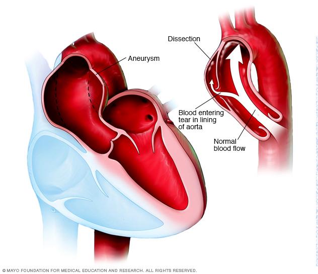 - Aortic dissection. The wall of the aorta is made up of layers. Dissection occurs when a small tear in the innermost layer of the aorta's wall allows blood to squeeze between the inner and outer layers of the wall. This can cause severe pain in the chest or back. An aortic dissection weakens the vessel's structure and can result in a rupture, which may be fatal.