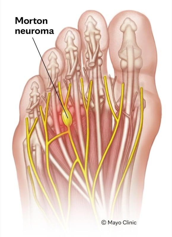 The exact cause of Morton neuroma is not known, but it's likely related to pressure on the nerve. High-heeled or narrow shoes may worsen the symptoms of Morton neuroma.