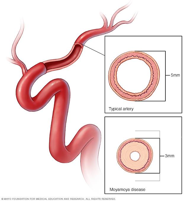 Moyamoya disease is a rare blood vessel condition in which the carotid artery in the skull becomes blocked or narrowed. The carotid artery is a major artery that brings blood to the brain. When it's blocked, blood flow to the brain is reduced. Tiny blood vessels then form at the base of the brain to supply the brain with blood.