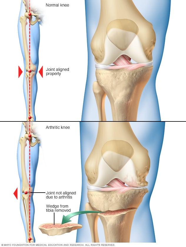 - Realigning bones. If osteoarthritis has damaged one side of your knee more than the other, an osteotomy might be helpful. In a knee osteotomy, a surgeon cuts across the bone either above or below the knee and removes or adds a wedge of bone. This shifts your body weight away from the worn-out part of your knee.