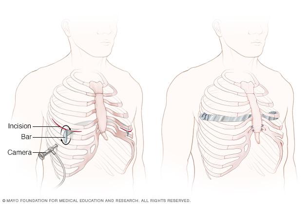 - Nuss procedure. This is the more common type of surgery. It's minimally invasive, meaning it's done through small cuts. In general, the surgeon makes small cuts on each side of the chest. The surgeon places long-handled tools and a tiny camera through the cuts. Then the surgeon threads a curved metal bar under the sunken breastbone. The bar is rotated to raise the breastbone into a more typical position. Often, more than one bar is used. The bars are removed after about two or three years.