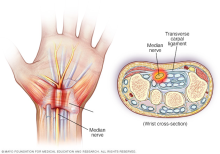 In carpal tunnel syndrome, a variety of tissues may be responsible for compression of the carpal tunnel's median nerve in the wrist. It can be caused by swollen tendon sheaths within the tunnel, enlarged bone that narrows the tunnel, or a thickened and degenerated ligament.