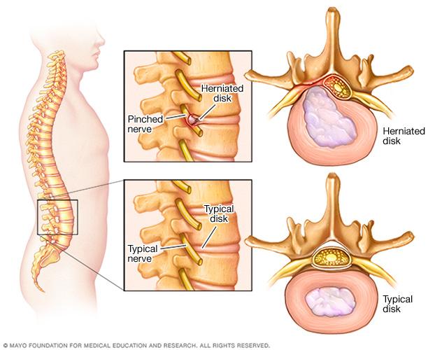 This tissue might be bone or cartilage, such as when a herniated spinal disk compresses a nerve root. Or muscle or tendons may compress a nerve.