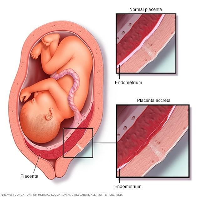 If you have risk factors for placenta accreta during pregnancy — such as the placenta partially or totally covering the cervix (placenta previa) or a previous uterine surgery — your health care provider will carefully examine the implantation of your baby's placenta.