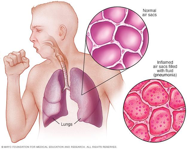 Pneumonia is an infection that inflames the air sacs in one or both lungs. The air sacs may fill with fluid or pus (purulent material), causing cough with phlegm or pus, fever, chills, and difficulty breathing. A variety of organisms, including bacteria, viruses and fungi, can cause pneumonia.