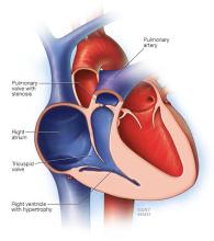 - Thickening of the heart muscle. In severe pulmonary stenosis, the lower right heart chamber must pump harder to force blood into the pulmonary artery. The strain on the heart causes the muscular wall of the ventricle to thicken. The condition is called right ventricular hypertrophy.