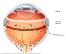 - Indenting the surface of your eye. This surgery, called scleral (SKLAIR-ul) buckling, is used to repair a retinal detachment. Your surgeon sews a small piece of silicone material to the outside eye surface, called the sclera. This indents the sclera and relieves some of the force caused by the vitreous tugging on the retina and reattaches the retina. This technique may be used with other treatments.
