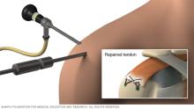 - Arthroscopic tendon repair. In this procedure, surgeons insert a tiny camera, called an arthroscope, and tools through small incisions. These tools are used to reattach the torn tendon to the bone.