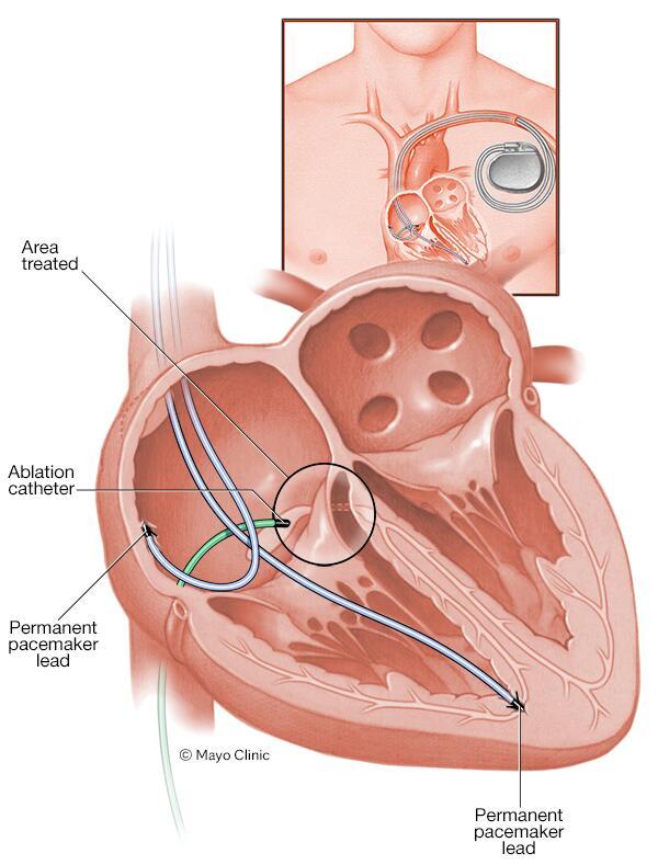 If your heart rate is still irregular after getting a pacemaker, you may need medications or a catheter-based procedure called cardiac ablation to correct or control it. Cardiac ablation uses heat or cold energy to create tiny scars in the heart to block faulty signals and restore a regular heartbeat. It's most often done using thin, flexible tubes called catheters inserted through the veins or arteries. Less commonly, ablation is performed during cardiac surgery. A type of cardiac ablation called AV node ablation is often used to control fast heart rhythms in people with pacemakers.