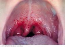 - Tiny red spots on the area at the back of the roof of the mouth (soft or hard palate)