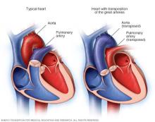 In this condition, also called dextro-transposition of the great arteries (d-TGA), the position of the two arteries leaving the heart is switched. The pulmonary artery connects to the left lower heart chamber. The aorta connects to the right lower heart chamber.