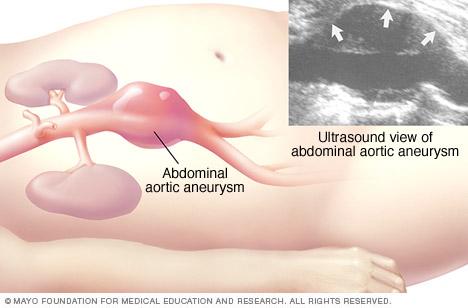 An abdominal aortic aneurysm, or aortic aneurysm, is an enlarged area in the lower part of the body's main artery, called the aorta. Healthcare professionals recommend an abdominal ultrasound to screen for aortic aneurysm in men ages 65 to 75 who smoke or used to smoke.