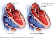 - Aortic valve regurgitation. The aortic valve doesn't close properly, causing blood to flow backward into the left lower heart chamber. Any condition that damages the aortic valve can cause regurgitation. Sometimes, a baby is born with an irregularly shaped aortic valve that leads to regurgitation.