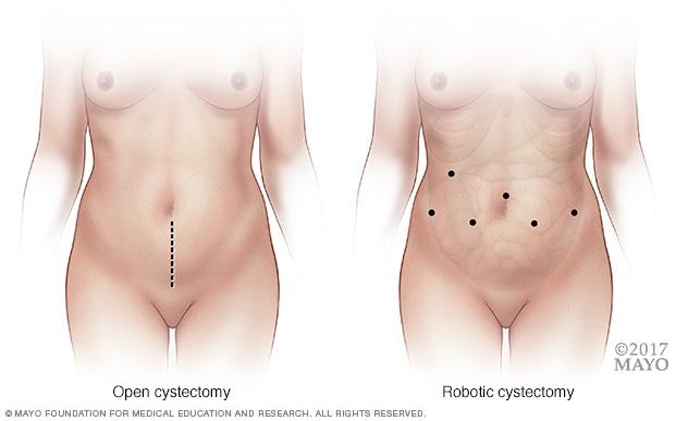 - Open surgery. This approach uses a single cut, called an incision, on the belly to get to the pelvis and bladder.