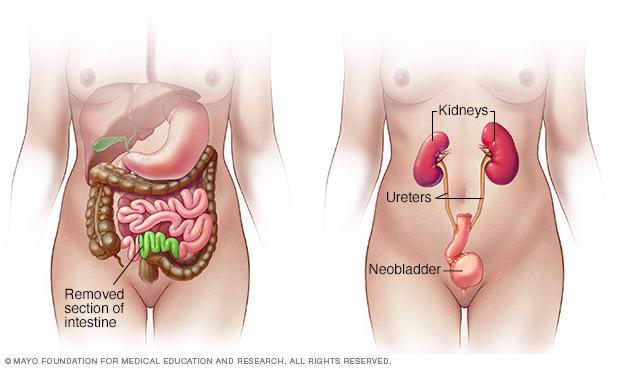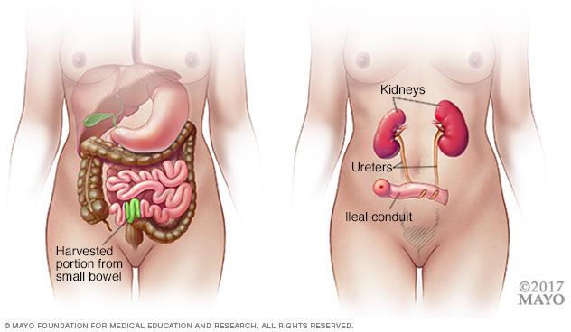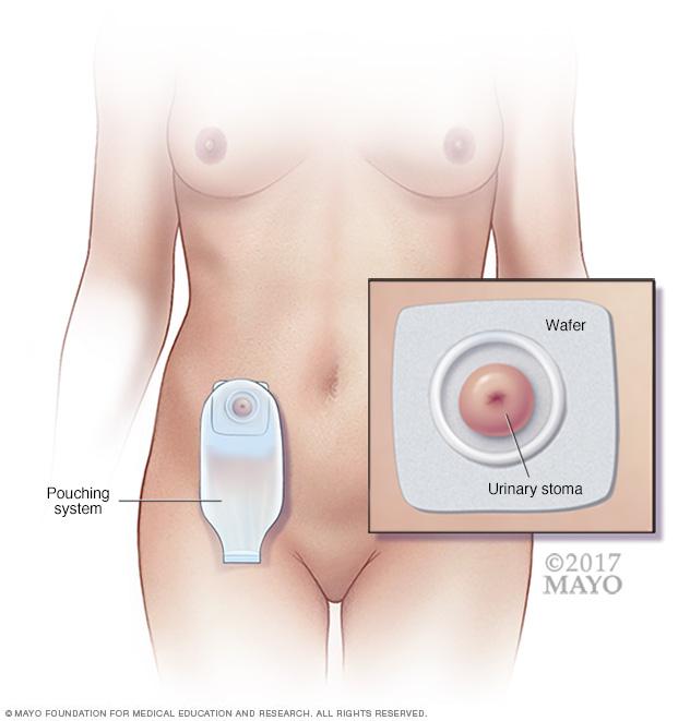 Urine drains into the conduit and passes outside the body through a hole in the wall of the belly, called a stoma. The urine collects in a pouch worn under clothes. The pouch needs to be drained often and replaced regularly.