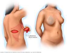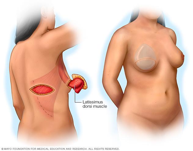 Latissimus dorsi flap surgery takes skin, fat and muscle from the back. The surgeon transfers it under the skin to the chest. This kind of flap surgery typically takes less skin and fat than other kinds of flaps, so this approach most often uses a breast implant with the flap.