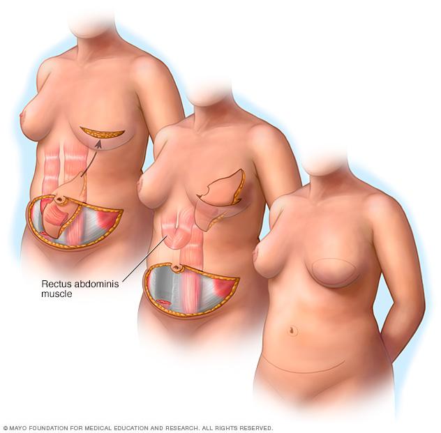 Deep inferior epigastric perforator flap surgery, also called DIEP flap surgery, also uses tissue from the belly. It's like TRAM flap surgery, but the surgeon takes only skin and fat from the belly to form the new breast. The surgeon leaves most of the abdominal muscle in place. A plus of this type of breast reconstruction is that it leaves more strength in the abdominal muscles.