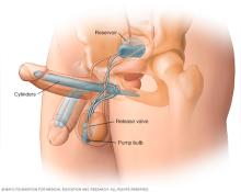 The two-piece model works in a similar way, but the fluid reservoir is part of the pump implanted in the scrotum. In both devices, the reservoir is filled with salt water the day of surgery and remains in the device.