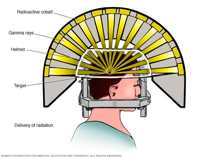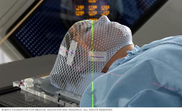 Head frame placement. Before the procedure begins, you'll have a lightweight frame attached to your head with four pins. This frame will stabilize your head during the radiation treatment and serve as a point of reference for focusing the beams of radiation. Some types of brain radiosurgery may not require head frame placement.
