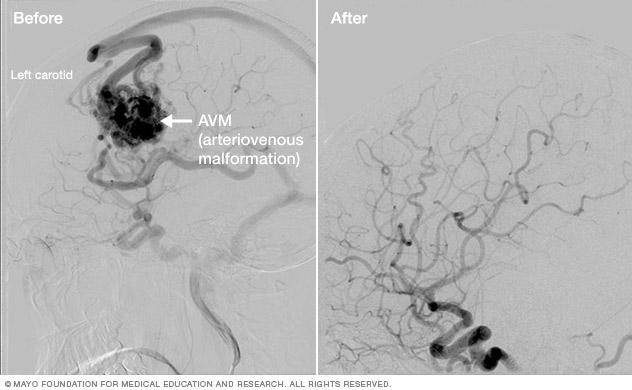 - Arteriovenous malformations (AVMs). The radiation therapy causes the abnormal blood vessels of brain AVMs to thicken and close off. This process may take two years or more.