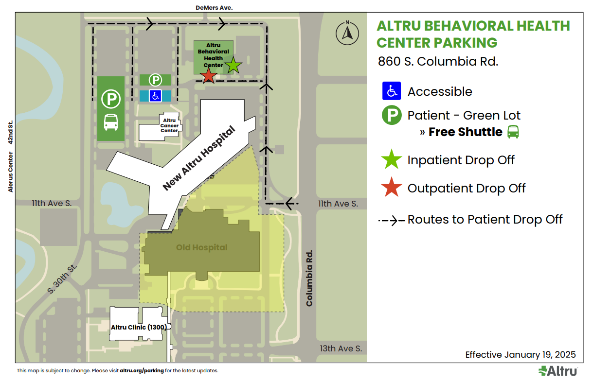 The city bus has a stop between Altru Clinic (Altru 1300) and Valley Senior Living. Patients will be able to call 701.780.1079 for a courtesy shuttle to take them over to the new hospital, if needed, or other locations on campus.